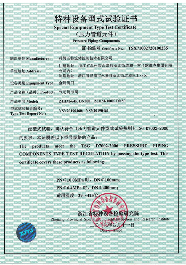 特種設(shè)備型式試驗(yàn)證書(氣動(dòng)調(diào)...