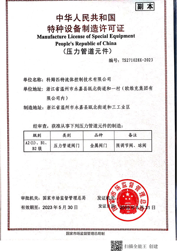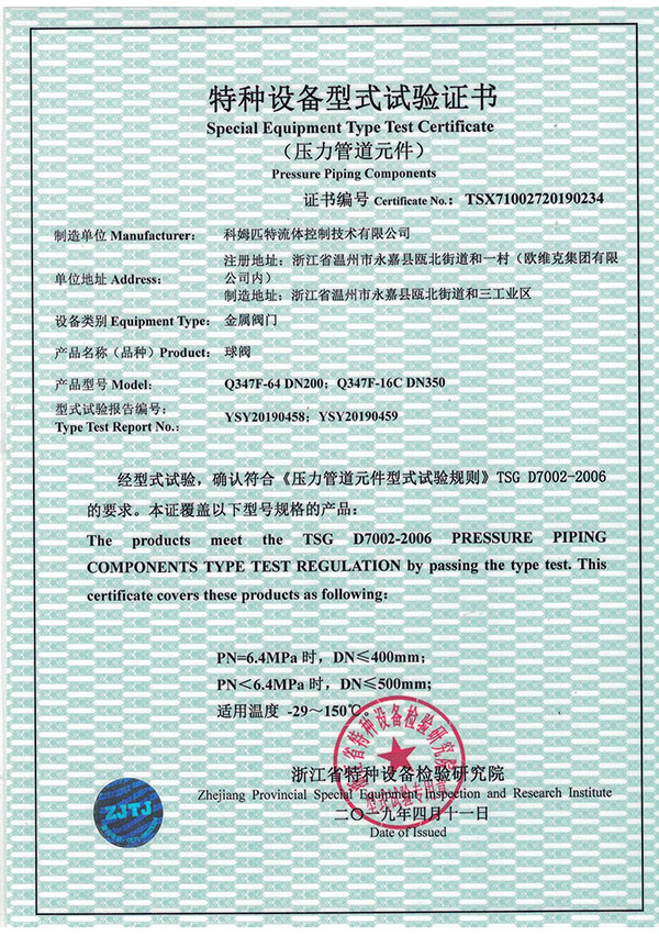 特種設(shè)備型式試驗(yàn)證書(球閥)